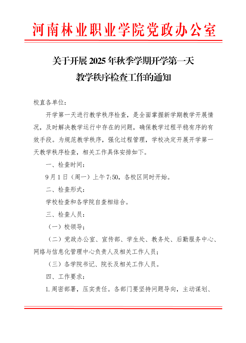关于开展2025年秋季学期开学第一天教学秩序检查工作的通知 作者:党政办公室 来源:党政办公室 发布时间:2025-08-29 08:30:38 浏览次数: 次 【字体:小 大】 分享到: 【打印正文】