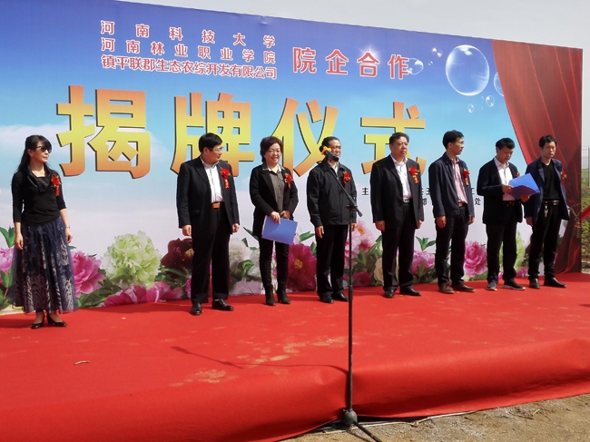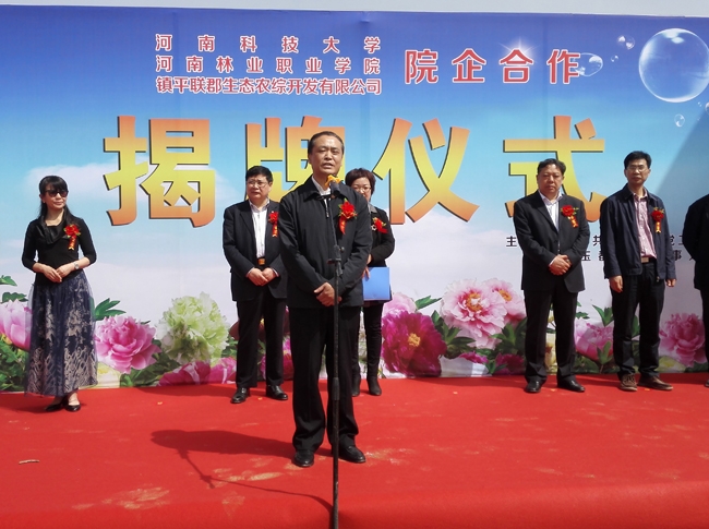 4月17日,河南林业职业学院院长宋宏伟、河南科技大学牡丹学院院长侯小改受邀参加河南林业职业学院、河南科技大学和河南镇平联郡农综生态开发有限公司院企科技合作揭牌仪式。镇平县县委副书记赵浩、县政协主席任瑞林及县委办、政府办、宣传部、发改委、财政局、农业局、林业局、水利局等19个单位的负责人参加。镇平县县委副书记赵浩致辞,宋宏伟院长、侯小改院长分别讲话。县委常委、统战部长刁晓英主持揭牌仪式。