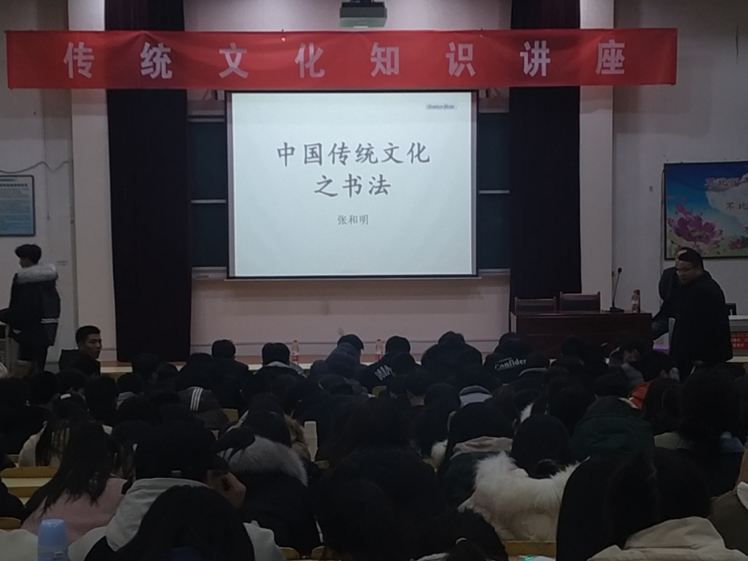书法是中华民族的艺术瑰宝,对于传承民族文化有着不可替代的重要作用。为弘扬传统文化,助力我院校园文明建设,基础部于12月3日晚在西阶梯教室举办“中国传统文化--书法艺术讲座”。本次讲座特邀中文教研室主任张和明老师为大家讲解,全院近300余名学生聆听了讲座。