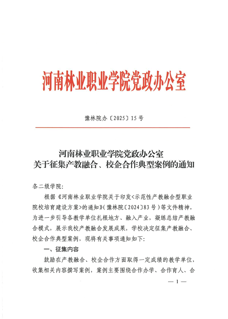 关于征集产教融合、校企合作典型案例的通知 作者:教务处 来源:教务处 发布时间:2025-04-12 16:56:29 浏览次数: 次 【字体:小 大】 附件1典型案例撰写说明.docx附件4案例汇总表.docx附件3案例推荐表.docx附件2典型案例格式要求.docx 终审:马丹丹 分享到: 【打印正文】