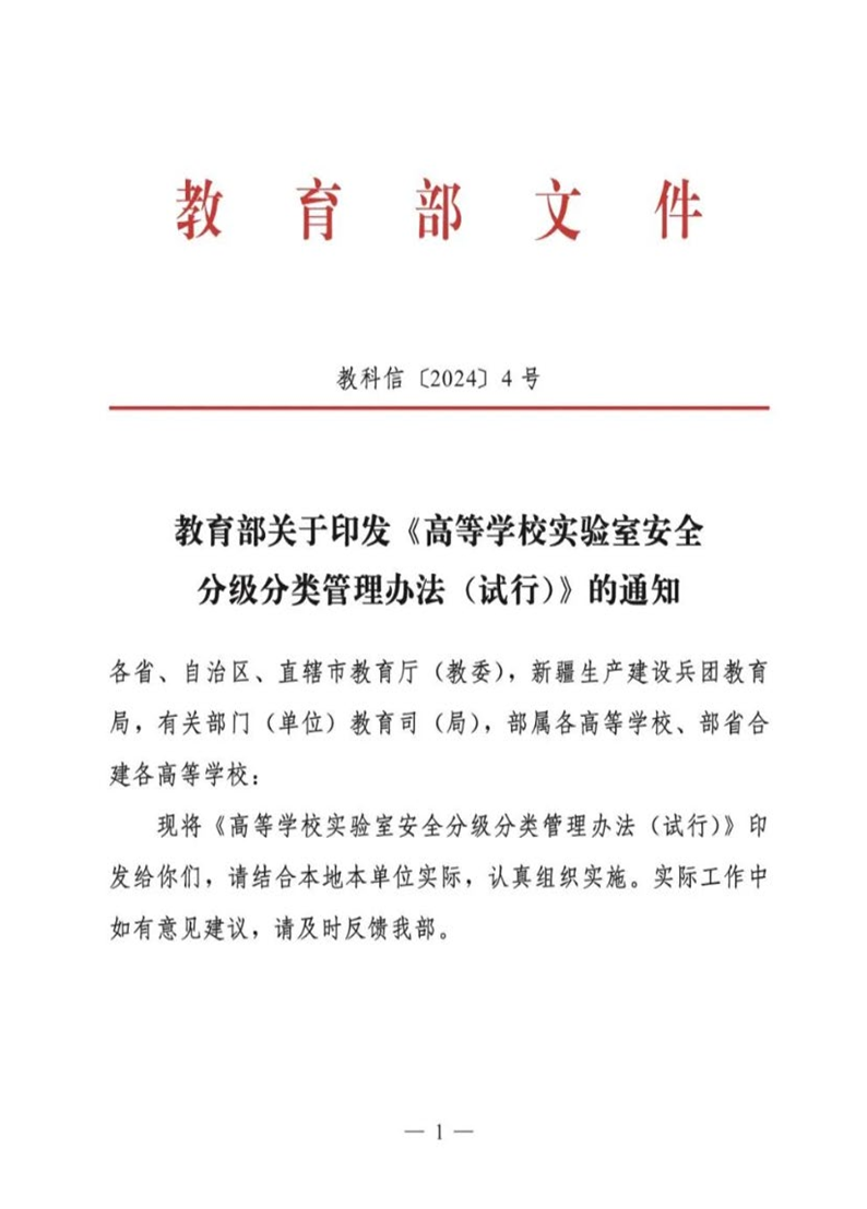 教育部关于印发《高等学校实验室安全分级分类管理办法(试行)》的通知(教科信〔2024〕4号) 作者:教务处 来源:学院办公室 发布时间:2024-05-01 08:25:44 浏览次数: 次 【字体:小 大】 终审:赵晓东 分享到: 【打印正文】