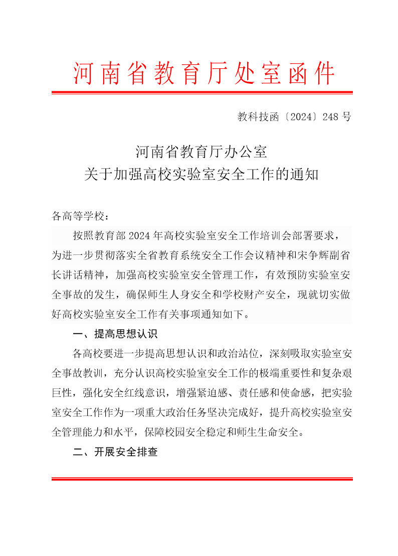 河南省教育厅办公室关于加强高校实验室安全工作的通知 作者:教务处 来源:学院办公室 发布时间:2024-05-01 18:08:32 浏览次数: 次 【字体:小 大】 终审:赵晓东 分享到: 【打印正文】
