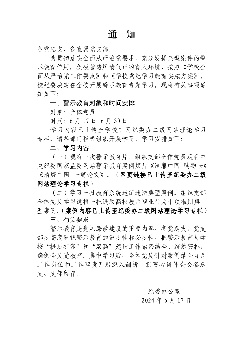 关于开展警示教育学习的通知