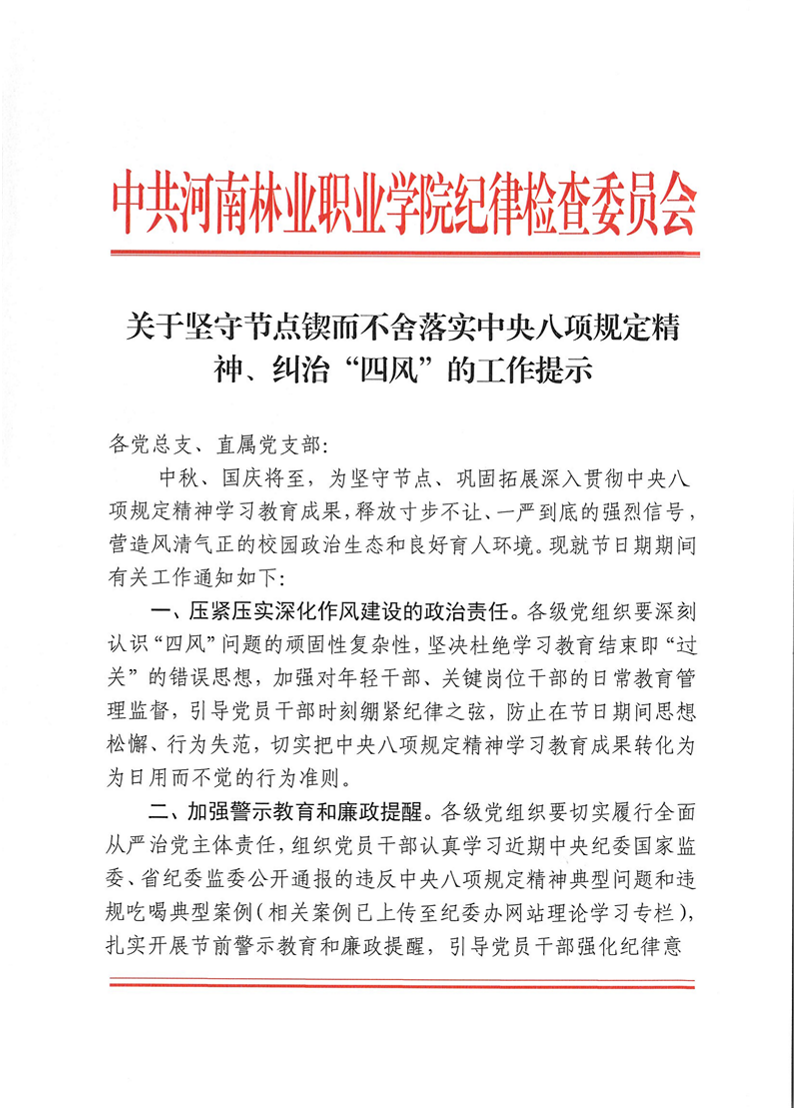关于坚守节点锲而不舍落实中央八项规定精神、纠治“四风”的工作提示