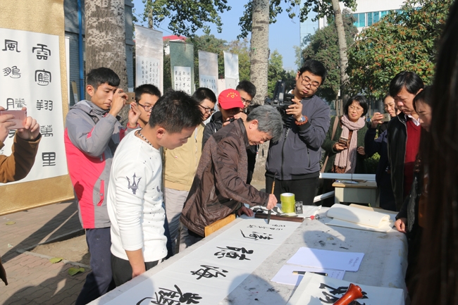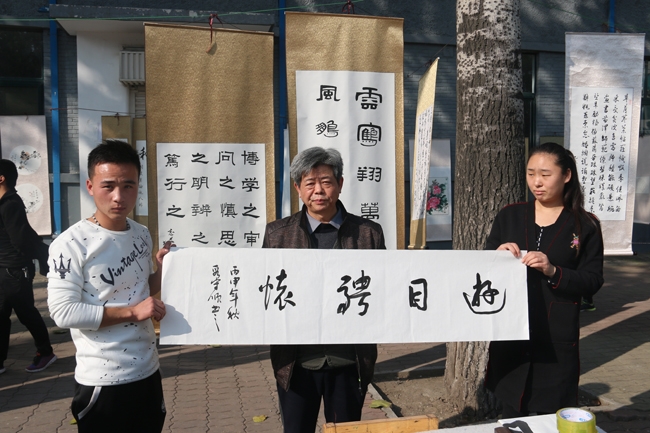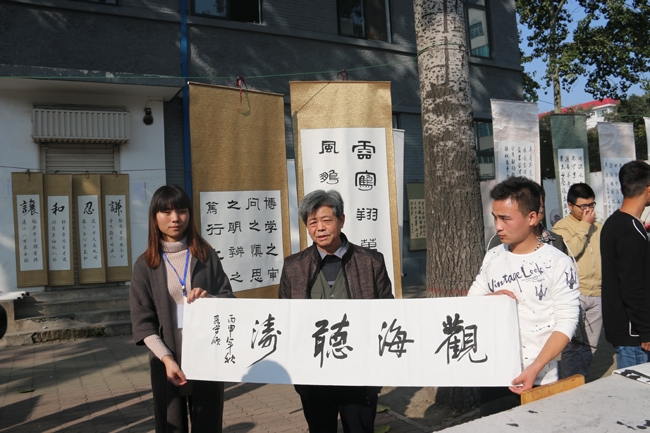 近年来,学院学生社团保持了良好的发展势头,共有各类社团26个,涵盖了学习、生活、技能等多个方面,活动内容也由兴趣型为主,向兴趣和技能实践型并重转变,丰富多彩的社团活动已经成为校园一道靓丽的风景,引领、带动着学生们的课余文化生活。简短的开幕式结束后,关工委老教师们走进学生社团中间,兴致勃勃地观看了各社团成果展。在学生书画社展台前,擅长绘画的孟文亮老师对同学们的绘画作品进行了点评和指导,工于书法的段守顺老师欣然挥毫,为同学们写下了“观海听涛”、“游目骋怀”两条横幅,勉励同学们开阔胸怀,静心刻苦,在书画道路上不断进步。