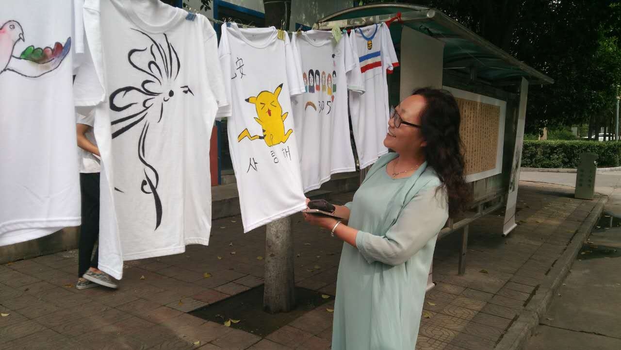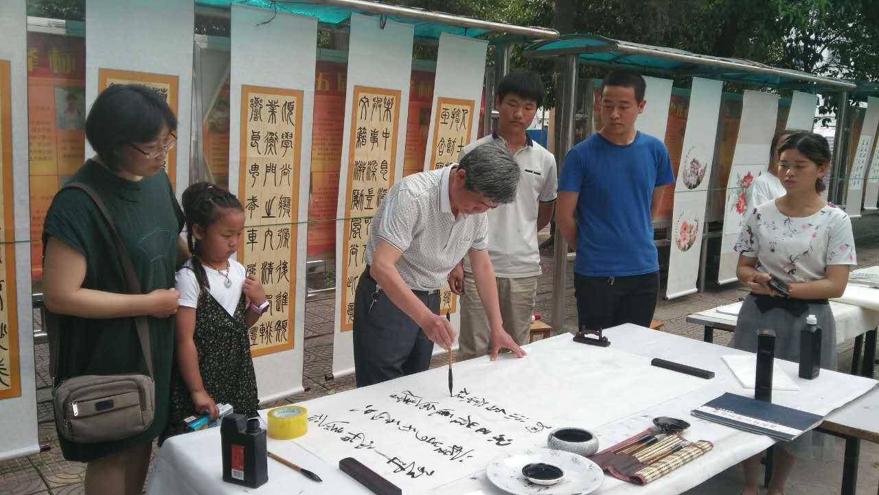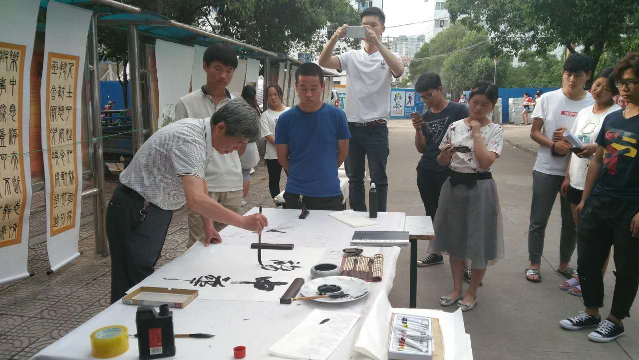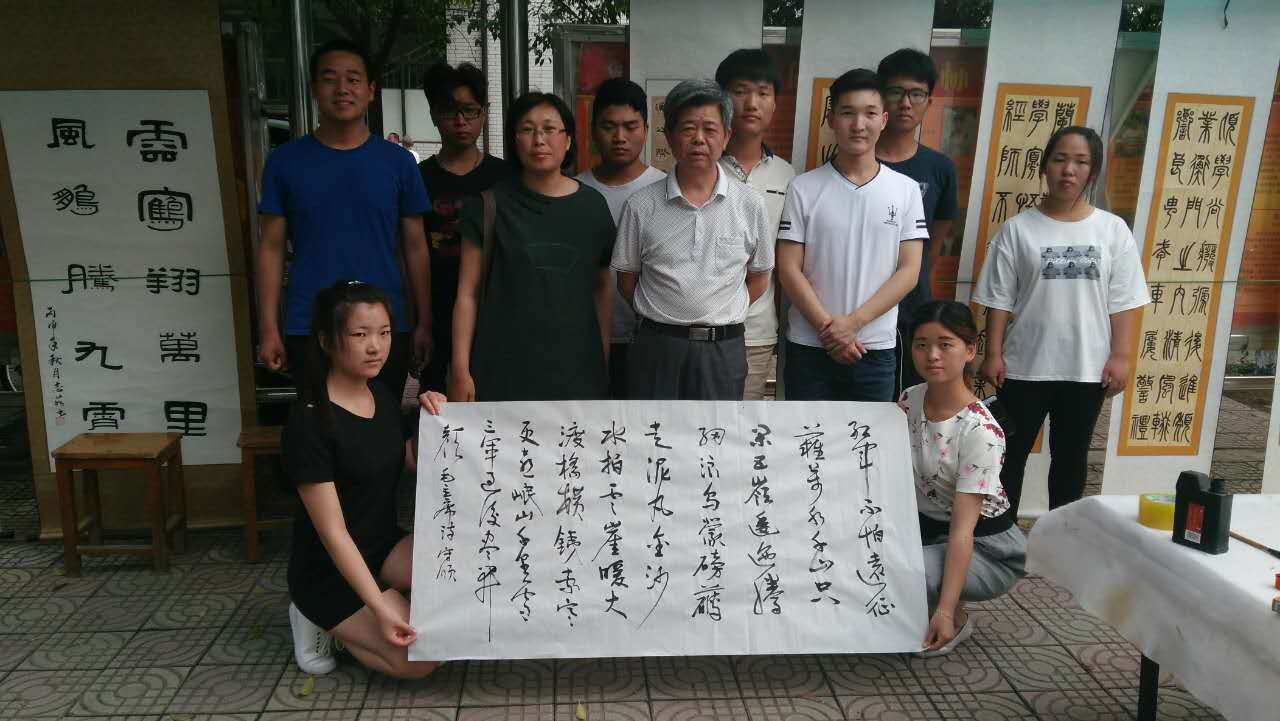 孟文亮老师对学生们的绘画作品和文化衫涂绘进行了指导,向同学们提出了许多改进的意见和建议;段守顺老师对学生们的书法作品进行了参观指导,特别是运笔和落款,段老师更是详细为大家做了讲解。参观结束后,应同学们邀请,段老师以纪念中国人民解放军建军90周年为主题,现场为同学们书写了毛主席的诗词七律《长征》和《中华雄风》两幅大字,并与书画社的同学们合影留念。