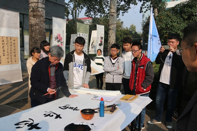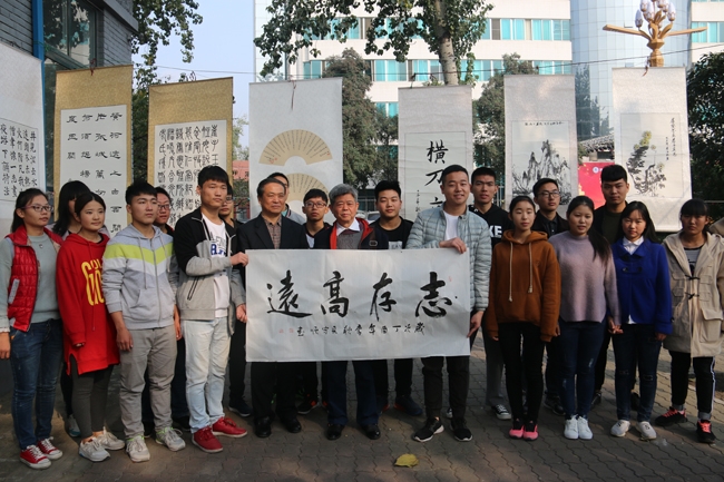 近年来,院团委以学生志趣为引领,组建有各类学生社团30多个。这些学生社团在院团委和各系、部老师的指导下各具特色,异彩纷呈,已成为同学们开阔视野、展现自我、激发潜能、提升素质、适应社会的重要平台。简短的开幕式结束后,关工委的房国华、段守顺、陈伟霜三位老教师、老同志依次对各社团成果进行了观摩指导。在文艺队展台前,陈伟霜同志对文艺队同学们的乐器演奏技法进行了指导。在书画社展台前,段守顺老师对同学们的书画作品进行了品评指导,并对在现场练习书法的同学作了下笔、运笔演示。最后,在书画社同学们的邀请下,段老师欣然挥笔,为同学们写下了“志存高远”条幅,鼓励同学们在人生的道路上不断进步。在条幅落款处段老师还郑重地盖上自己的印鉴。段老师朴实、严谨的作风,赢得了同学们连连称赞,纷纷涌上前去和段老师合影留念。
