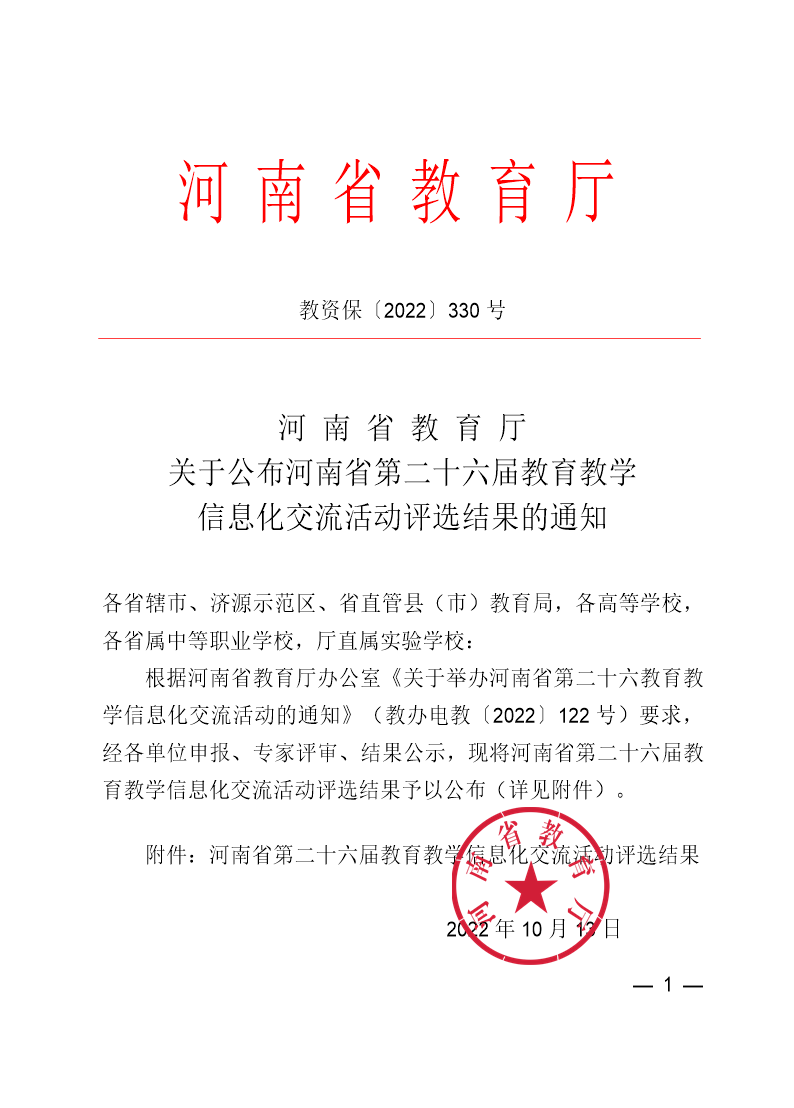 关于公布河南省第二十六届教育教学信息化交流活动评选结果的通知
