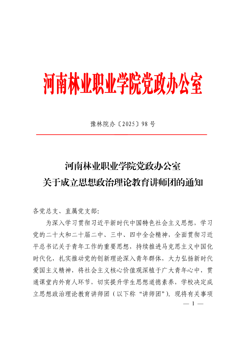 豫林院办〔2025〕98号 关于成立思想政治理论教育讲师团的通知 作者:党委宣传部 来源:党委宣传部 发布时间:2025-11-10 浏览次数: 次 【字体:小 大】 扫一扫在手机打开当前页 【打印正文】