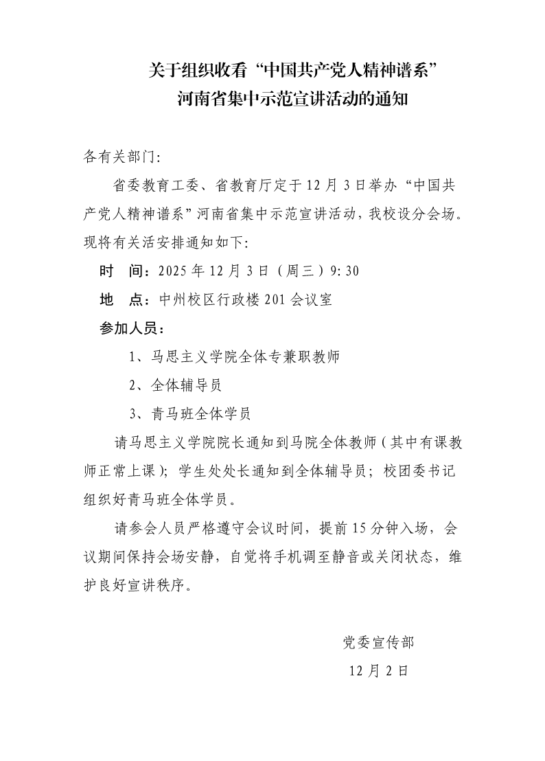 关于组织收看“中国共产党人精神谱系 ”河南省集中示范宣讲活动的通知 作者:党委宣传部 来源:党委宣传部 发布时间:2025-12-02 16:32:51 浏览次数: 次 【字体:小 大】 分享到: 【打印正文】