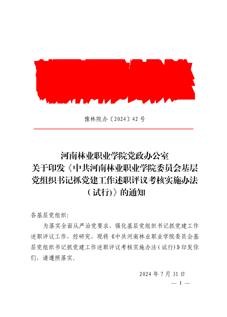 关于印发《中共河南林业职业学院委员会基层党组织书记抓党建工作述职评议考核实施办法(试行)》的通知 作者:组织部 来源:组织部 发布时间:2024-08-14 09:40:46 浏览次数: 次 【字体:小 大】 分享到: 【打印正文】
